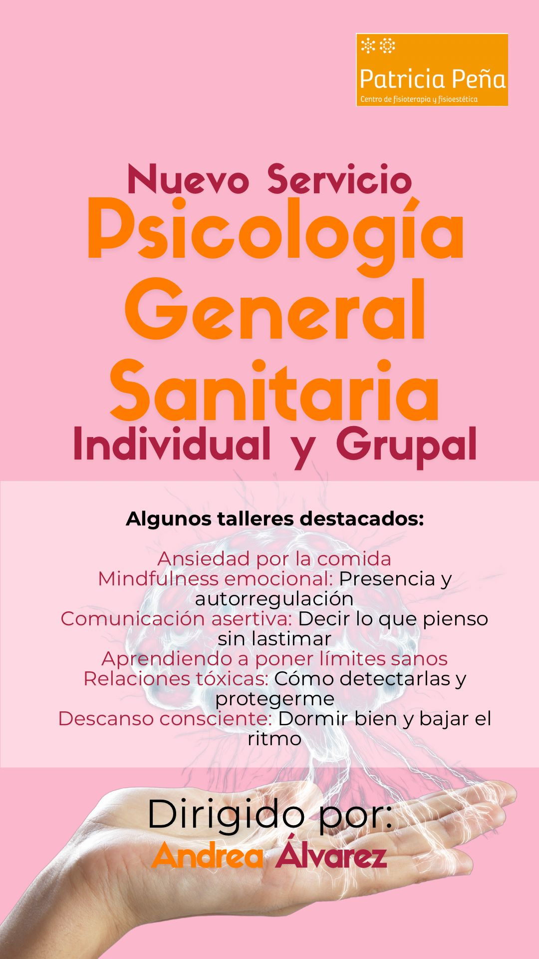 En Fisioterapia Patricia Peña hemos puesto en marcha un servicio de Psicología General Sanitaria, orientado a ayudarte a comprender lo que te ocurre, fortalecer tus recursos personales y recuperar tu bienestar emocional de forma profesional y cercana.